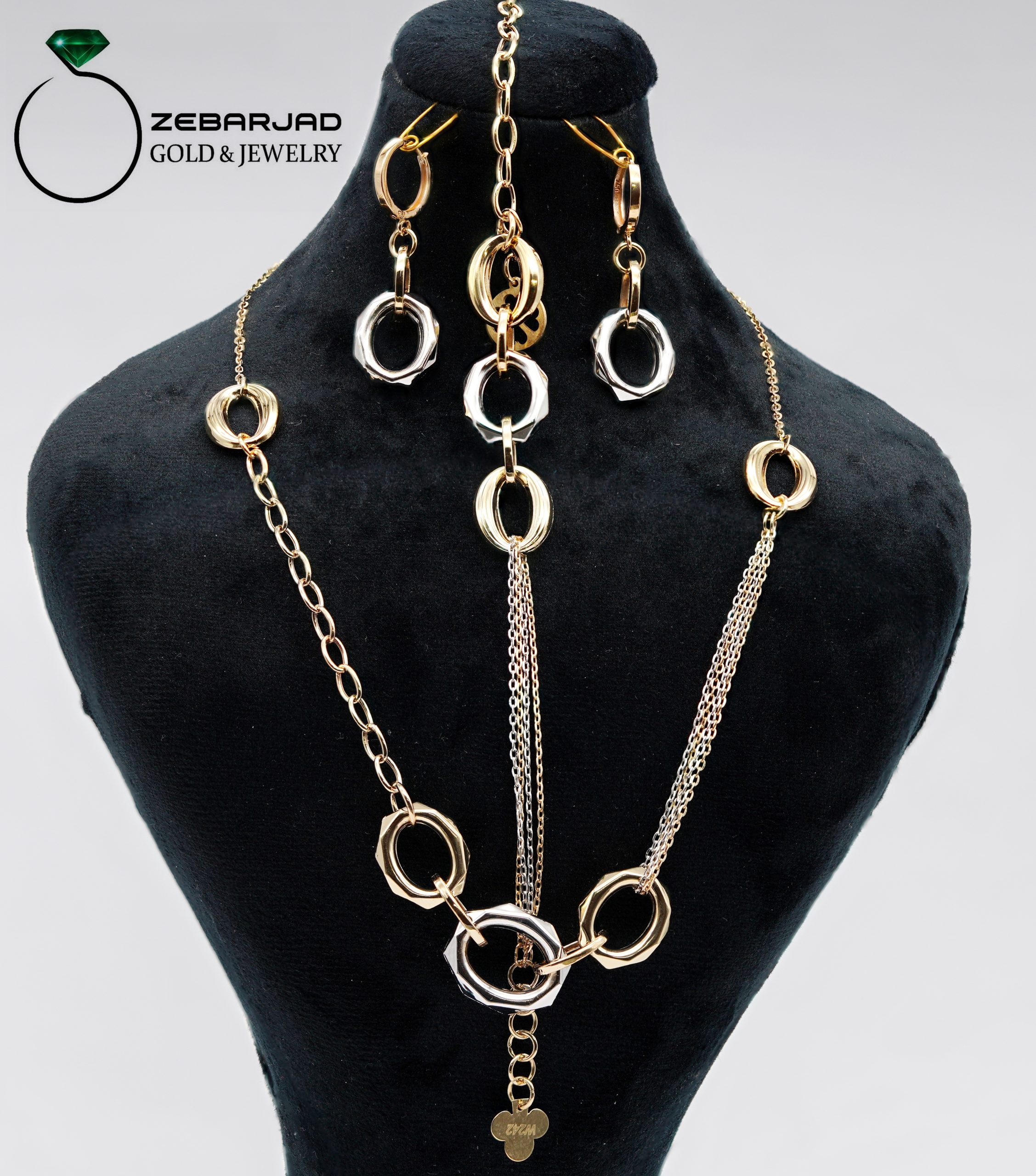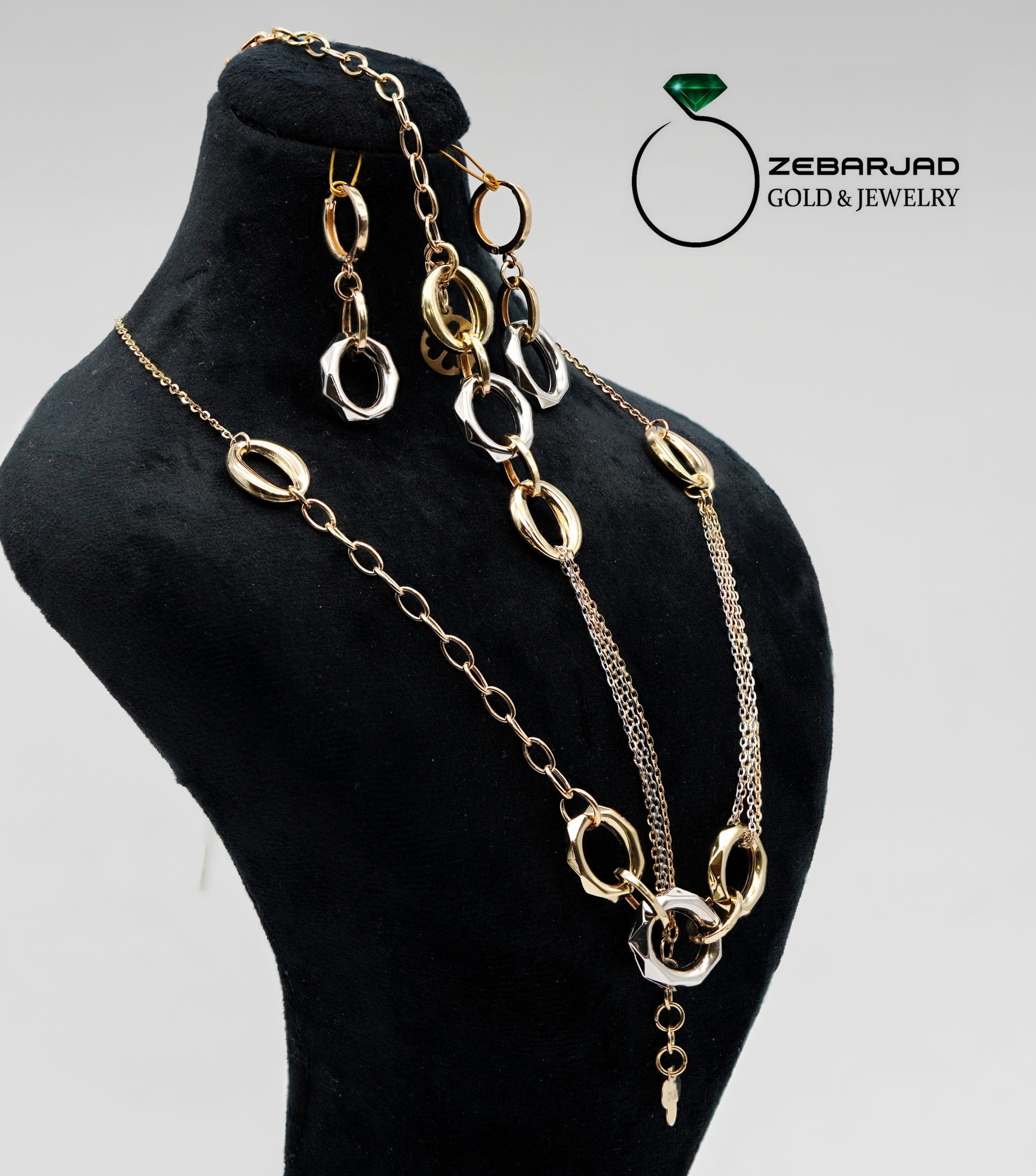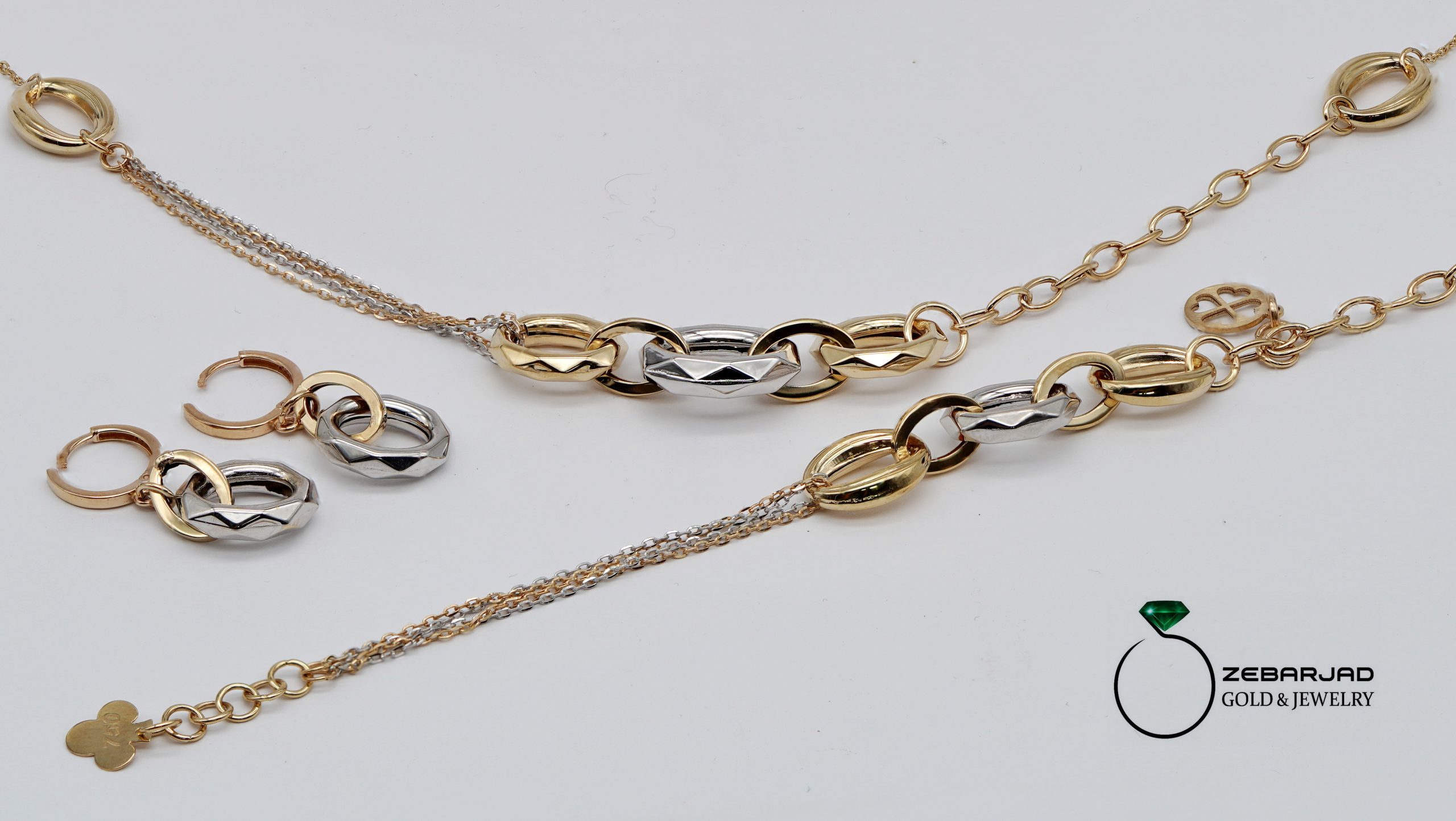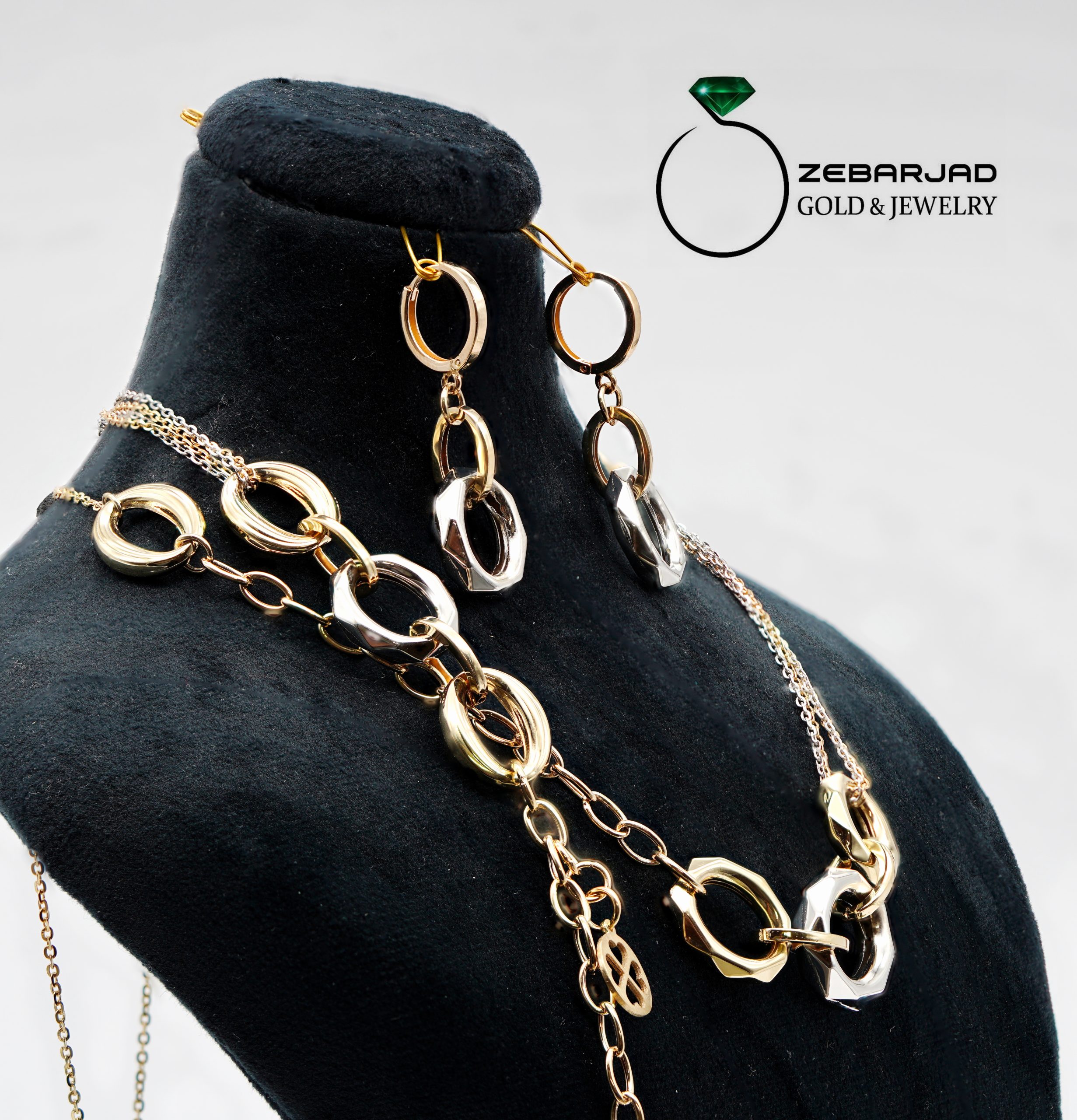 این سرویس خاص با ترکیب خیرهکننده طلای زرد و سفید، جلوهای مدرن و چندوجهی دارد. سطح براق و تراشهای آینهای آن، در هر زاویه نوری چشمنواز میدرخشد. در یک سمت گردنبند، چند رشته زنجیر فلامینگو با طراحی منحصربهفرد قرار دارد و در سمت دیگر، زنجیرهای توخالی ظریف و درخشان جلوهای متفاوت ایجاد کردهاند. دستبند نیز با همین سبک طراحی شده تا ست کامل و هماهنگی شکل بگیرد. گوشوارهها شامل چند حلقه با اشکال هندسی جذاباند که همان سبک توخالی و براق را دارند و جلوهای اسپرت، امروزی و فوقالعاده شیک به چهره میبخشند. این سرویس ترکیبی از ظرافت، مدرنیته و درخشش است؛ از آن مدلهایی که جای خالیش در ویترین هیچ مغازهداری نباید باشد.