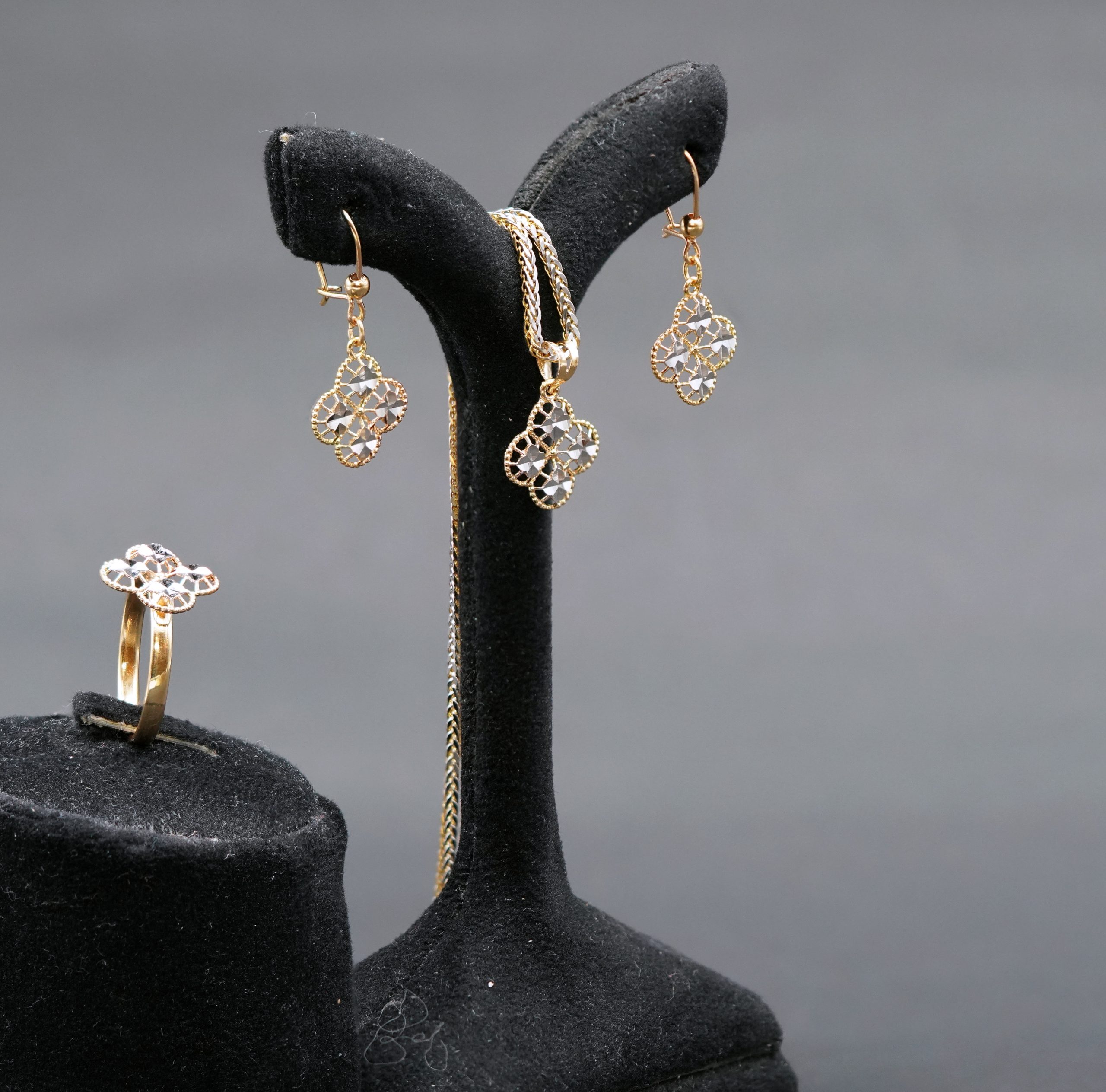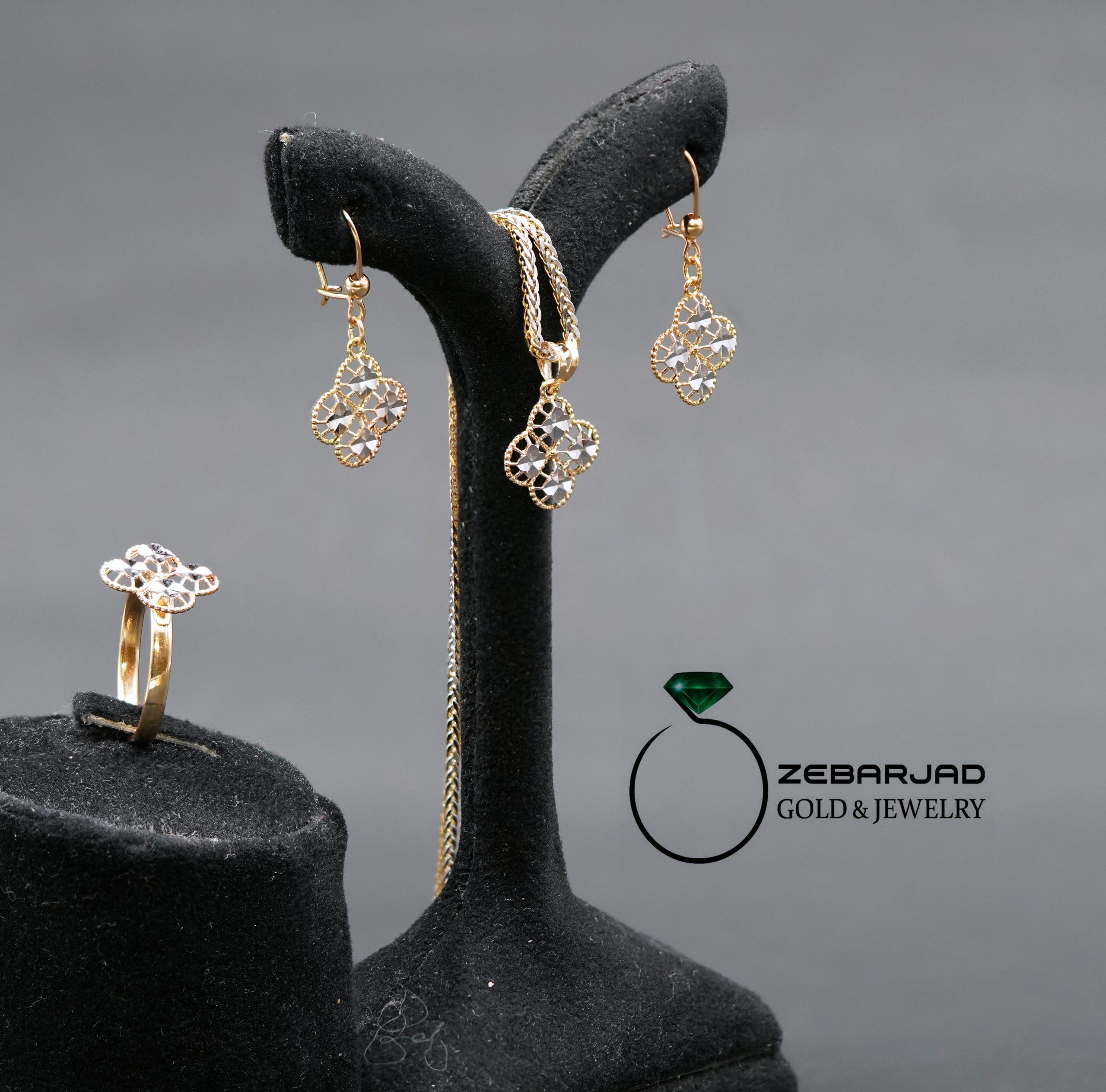 نیم‌ست شیک و مدرن ون‌کلیف شامل گوشواره، مدال و انگشتر با طرح گل‌های ریخته‌گری‌شده‌ی ظریف.