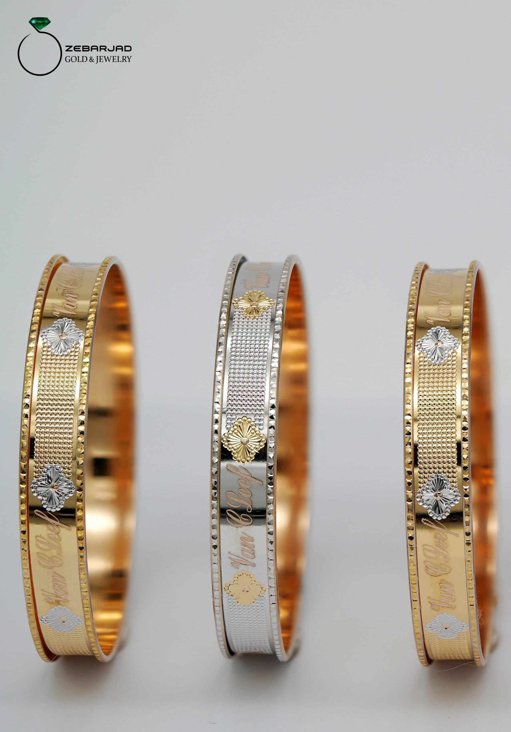 در حالت دوم، زمینه لبهها به رنگ سفید صیقلی و براق طراحی شده است که حس پاکی و سادگی را منتقل میکند. گلهای ون کلیف با رنگ زرد طلایی متضاد، روی این زمینه سفید برجسته شدهاند و جلوهای زنده و گرم به کار بخشیدهاند. لبههای گرد و نرم این النگو، با ترکیب این رنگهای متضاد و طرح گلهای ون کلیف، ترکیبی از ظرافت و جذابیت بصری را رقم زدهاند که برای هر سلیقهای مناسب و خاص خواهد بود.