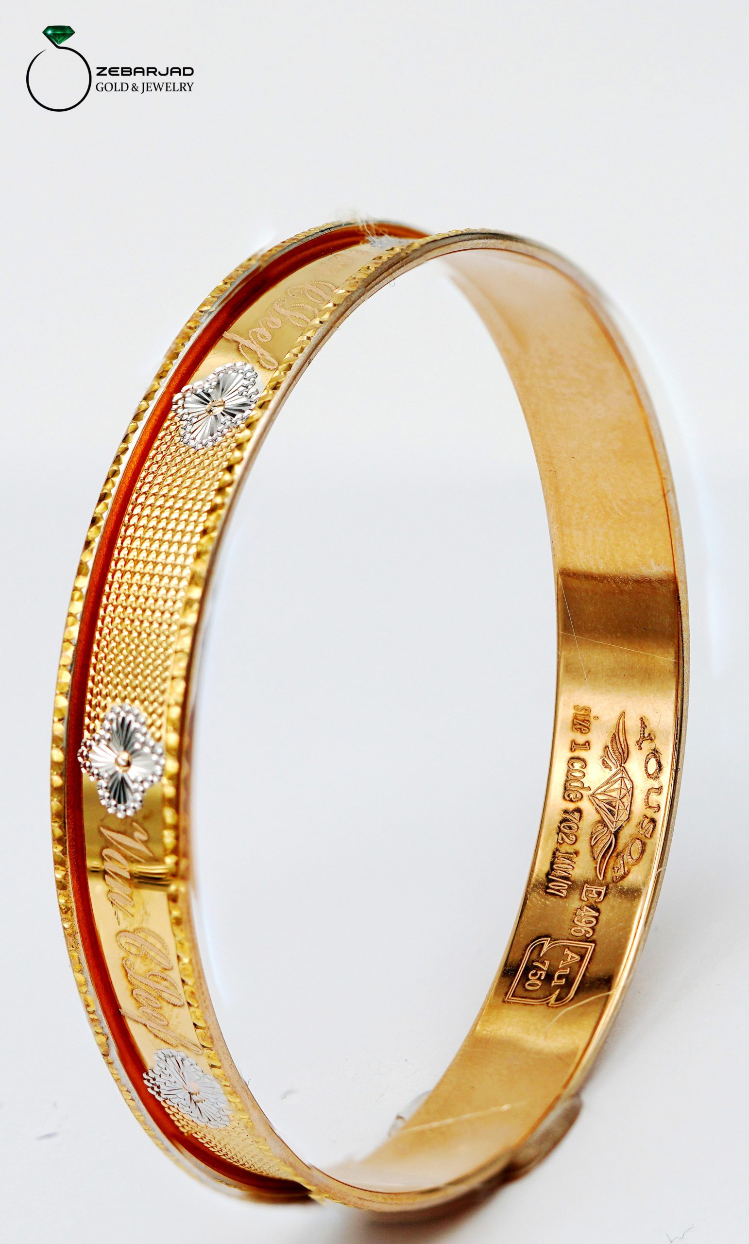 این النگو با طراحی منحصربهفرد خود، جلوهای خاص و چشمنواز به دست میبخشد. در حالت اول، لبههای گرد النگو با زمینهای زرد طلایی گرم پوشیده شدهاند و گلهای ظریف ون کلیف که رنگی سفید صدفی و متضاد با زمینه دارند، به زیبایی روی آن نقش بستهاند. این ترکیب رنگی، تعادل عالی بین گرما و لطافت را ایجاد کرده و جلوهای مدرن و در عین حال شیک به النگو میبخشد.